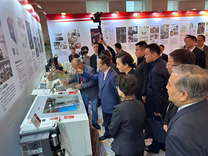 在頒獎典禮期間,一個令人振奮的場景在華之尊展區上演。全國人大常委會副委員長陳昌智在參觀過程中,特意駐足華之尊展區,對HZZ-V3000智慧型激光切雕一體機表現出濃厚興趣。陳昌智副委員長認真觀摩了設備的全流程現場演示,并不時就關鍵問題親切詢問。他詳細了解設備的市場定價、產能效率、核心技術參數以及行業應用情況,展現出對智能制造裝備產業化發展的高度關切。