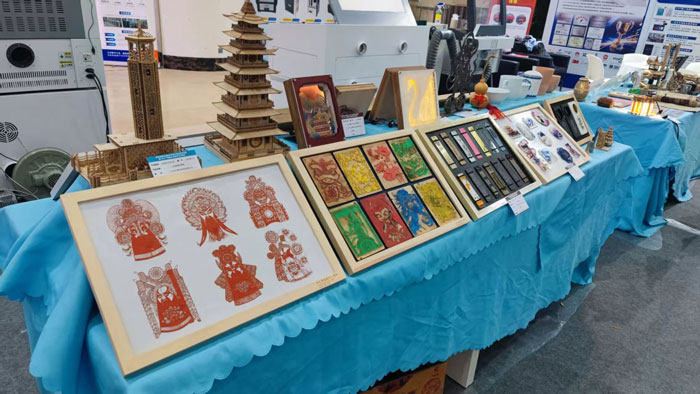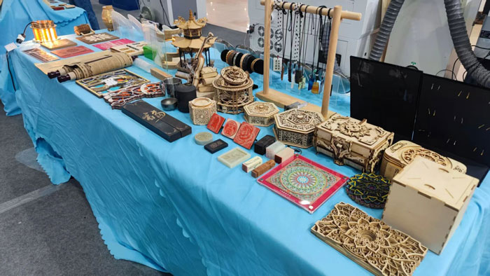 華之尊激光此次展出了多軸激光焊接/清洗機(jī)、激光打標(biāo)機(jī)、激光雕切一體機(jī)等多個(gè)領(lǐng)域激光設(shè)備,這些設(shè)備廣泛應(yīng)用于所有藝術(shù)設(shè)計(jì)類專業(yè),如:建筑裝飾、工藝美術(shù)、服裝服飾、陶瓷藝術(shù)、產(chǎn)品設(shè)計(jì)、平面視覺(jué)等各類專業(yè)。以下是華之尊激光在展會(huì)上的一些創(chuàng)新展示: